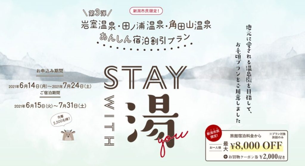 にいがた市民限定 岩室温泉・田ノ浦温泉・角田山温泉 あんしん宿泊割引キャンペーン – お一人様最大8,000円OFF!市民限定のお得な割引キャンペーン! (iwamurokankou.com)