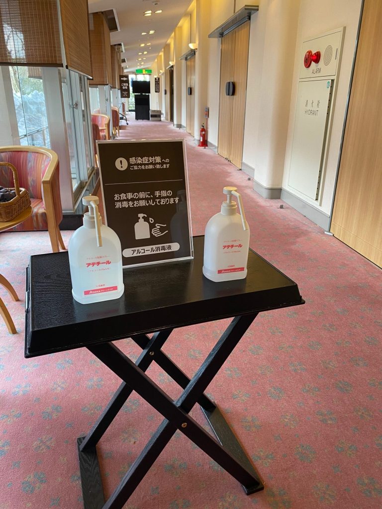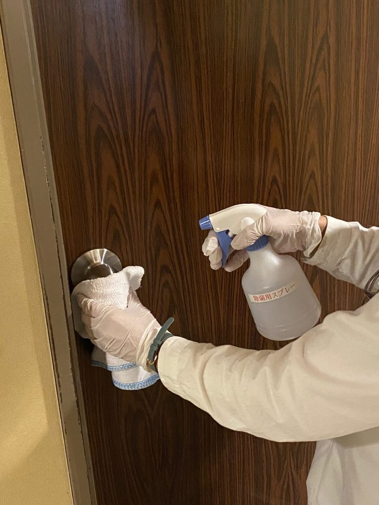 ■共用スペース(ロビー・トイレ・食事会場・大浴場・売店・ゲームコーナー・自販機など)の手に触れるスイッチやノブなどを中心に消毒対応を実施しております。