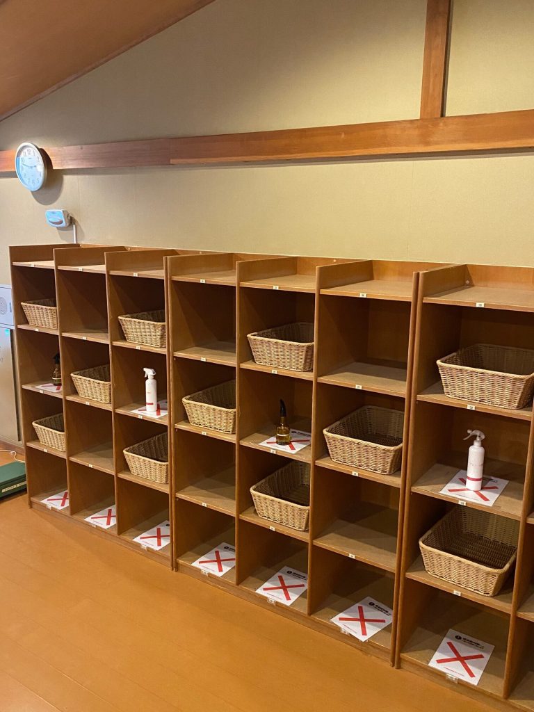 ■お客様同士の距離を保つ為、大浴場内での洗い場は一部を使用禁止、脱衣所の脱衣カゴについては一列ごとに使用禁止とさせていただいております。