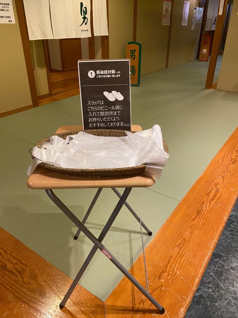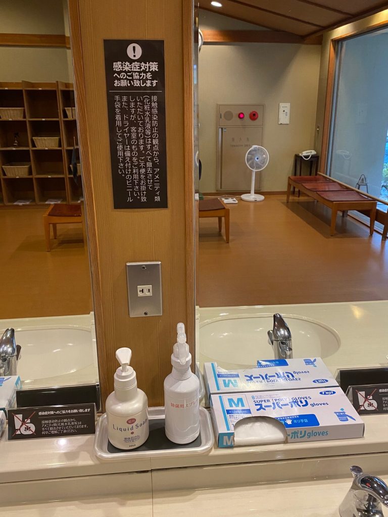 ■接触感染防止の観点から、脱衣場のアメニティ類(化粧水乳液等)はすべて撤去させていただいております。ご不便をお掛けいたしますが、客室のものをご利用ください。また、ドライヤーは備え付けのビニール手袋を着用してご使用ください。不安なお客様は自室のドライヤーをご利用ください。